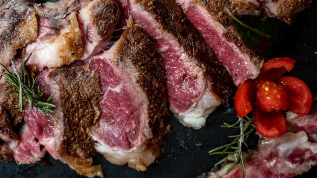 Tagliata di carne servita con rucola, pomodorini, scaglie di grana