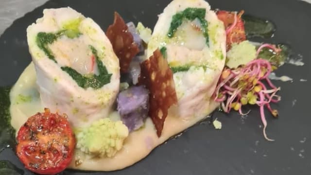Turbante di spigola con bieta e gambero rosso su una vellutata di broccoli e patate