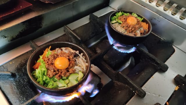 Bulgogi, carne tradicional de yan bian, barriga de porco temperada, barriga de boi temperada, camarão picante, lulas. Frango marinado, carne de cabrito. Sabor original de porco preto ibérico