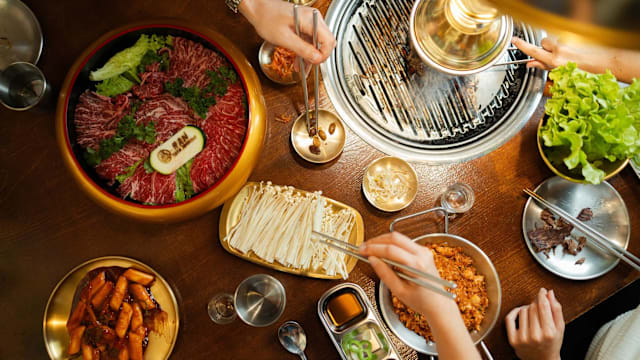 Bulgogi, carne tradicional de yan bian, barriga de porco temperada, barriga de boi temperada, camarão picante, lulas, frango marinado, carne de cabrito, sabor original de porco preto ibérico