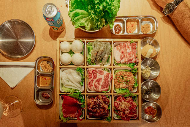 Bulgogi, carne de vaca temperada a hanam, entremeada, vazia temperada, frango marinado, porco preto ibérico, camarão kimchi, lulas limpas, cogumelos