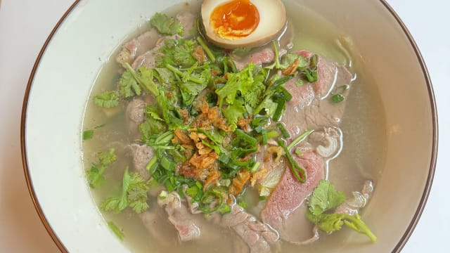 Bouillon de poulet avec tranches de bœuf émincé bouilli et coriandre