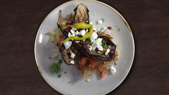In italy this dish is called ‘ueva in purgatorio’, which means eggs in purgatory. This version is made with grilled bell pepper, basil, capers and finished with parmesan cheese. Served with pinsa bread