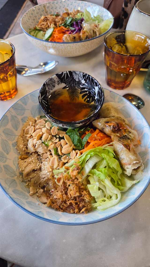 - Vermicelle de riz, salade, crudités, sauce maison, cacahuètes, oignons frites, nems, poulet sauté au citronnelle