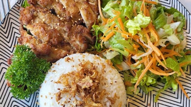 Riz parfumé au saveur viet, salade, crudités, poulet pané croustillant.
