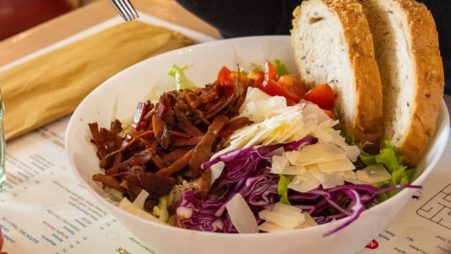 - Insalata, cappuccio e cumino, pomodoro, speck croccante all’aceto balsamico e scaglie di grana