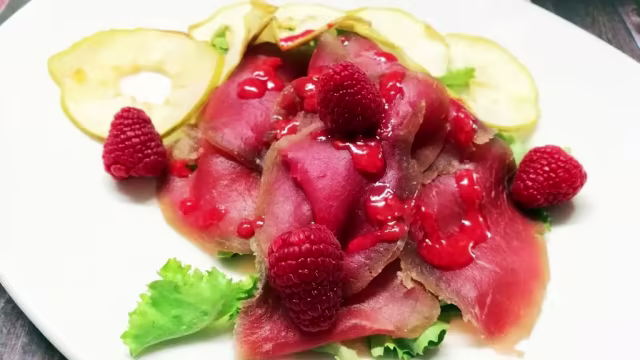 - Battuta di manzo piemontese con chips di cavolfiori multicolori e parmigiano, insalatina di rucola e noci marinata alla senape