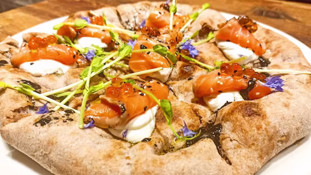 - Cotto a 62.5° e servito su fonduta di toma DOP, piselli alla menta, croccante di focaccia