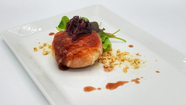 - Filetto di maiale marinato nella senape e avolto nel bacon, cotto a bassa temperatura e servito con chutney di mele renette e demi glace alla birra rossa