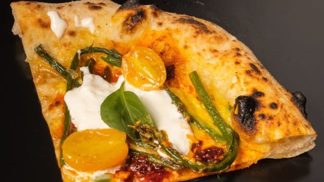 Con fior di latte, pomodoro nero di corbara, caciocavallo affumicato della penisola sorrentina, lonzardo di suino nero razza casertana, olio evo di corato e basilico