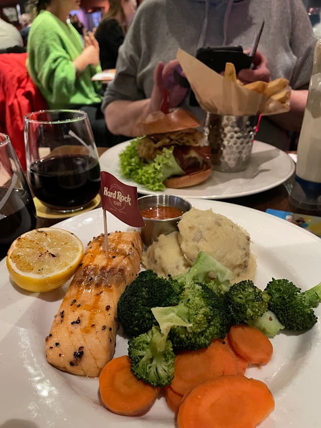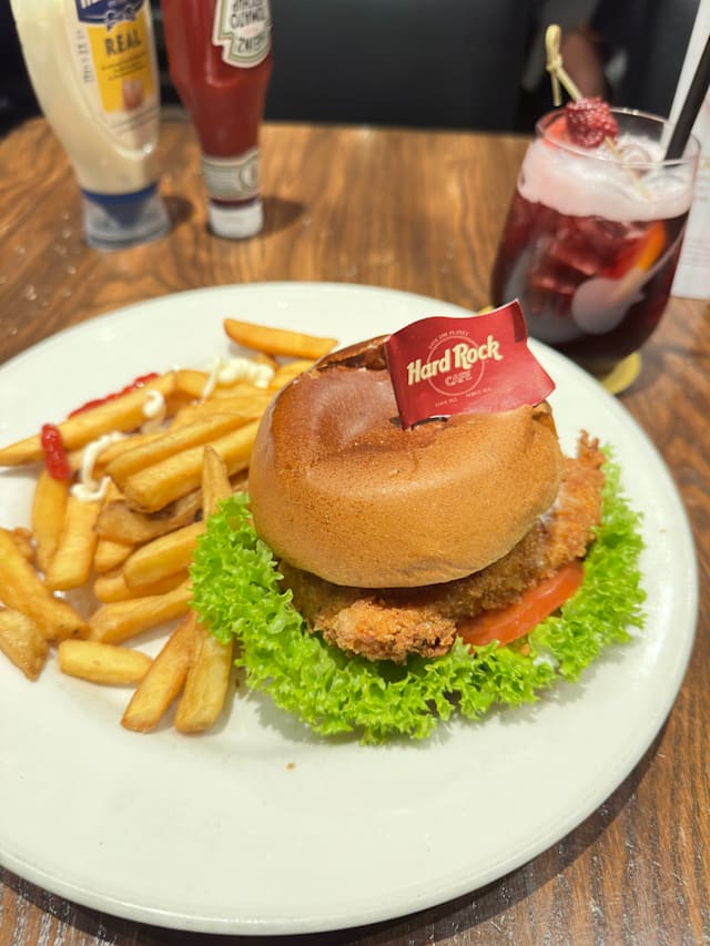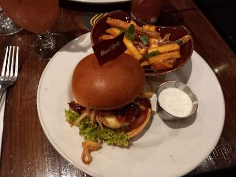 8.5/10Good service and very friendly staff but as attractive as the other Hard Rock Cafes around the world. The food was average. And after dinner we were all smelling oil. I think there is a big problem with the ventilation system. Tables at the ground floor near the water seem very nice!