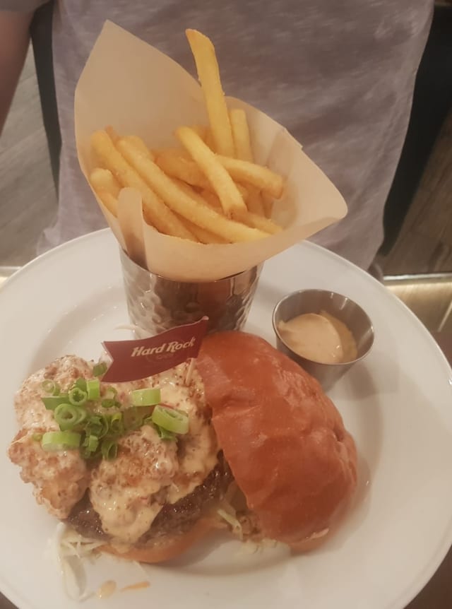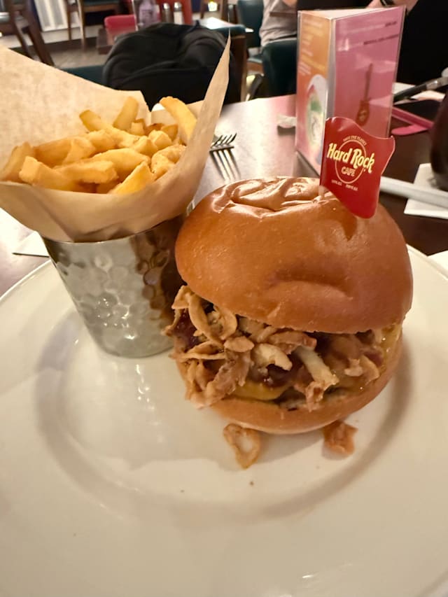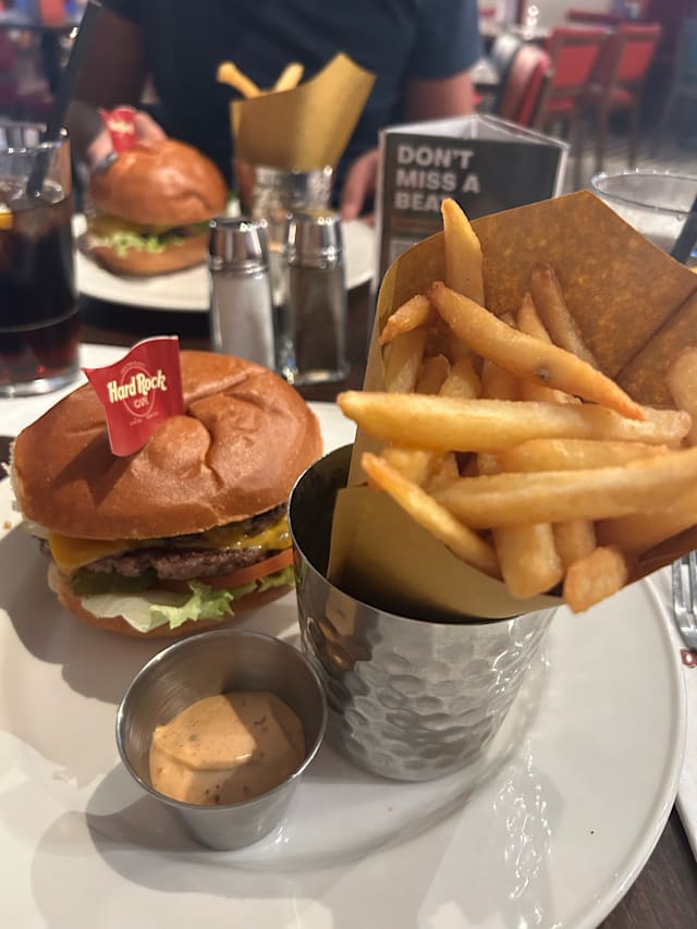 7/10We have visited Hard Rock cafes many times and always look forward to our visit. Start with the good points. The food was excellent as we have come to expect. Now the not so good. No welcome when we arrived and shown to our table. Within 30 seconds on sitting we were asked if we were ready to order. We asked for a few minutes to look through the menu. When the server returned they didn’t introduce themselves or ask how we were, which we’ve had in all the other HRC’s. Service was slow to clear the plates. This HRC lacked the friendly atmosphere we have come to expect. In summary great food, service and atmosphere needs attention. Disappointing experience.