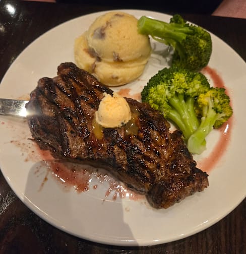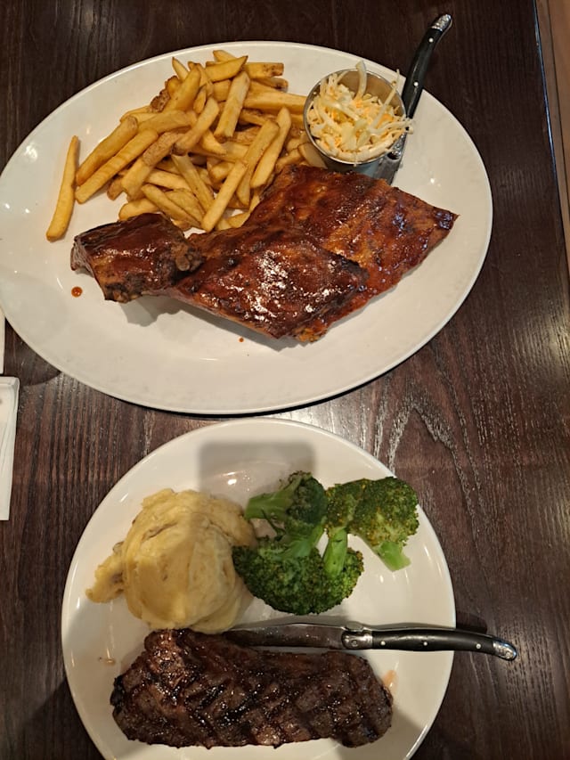 7.5/10Excellent service. Unmemorable BBQ ribs (cold and not fall off-the-bone).