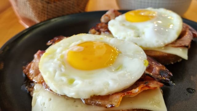 Bacon, ovo, feijão, salsicha, panquecas, mini pastelaria, molho hp e nutella