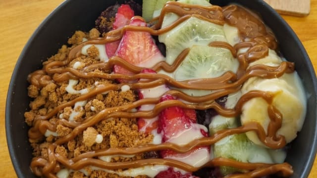Logurte, doce de abóbora, nozes e canela. Escolha: massa-clássica, vegan ou aveia/fruta:banana, morango, frutos vermelhos, manga, ananás, maçã ou kiwi/cobertura;nutella, manteiga de amendoim, lotus, leite condensado normal ou cozido, chocolate branco, mel ou compota