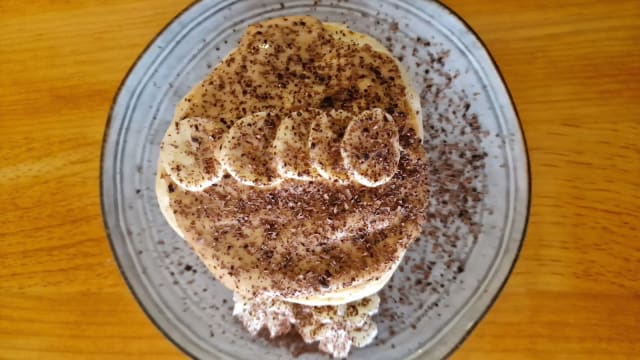 Banana, leite condensado cozido, raspas de chocolate e chantilly. Escolha: massa-clássica, vegan ou aveia/fruta:banana, morango, frutos vermelhos, manga, ananás, maçã ou kiwi/cobertura;nutella, manteiga de amendoim, lotus, leite condensado normal ou cozido, chocolate branco, mel ou compota