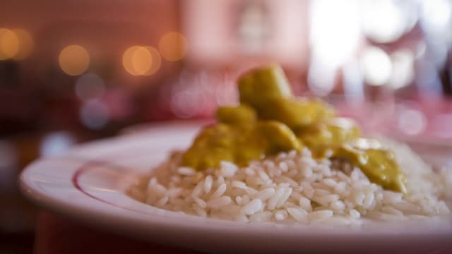 Pollo al curry harry’s style, riso pilaf e mango chutney
