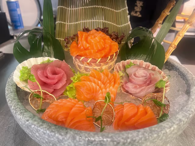 - Carpaccio di salmone, tonno, branzino, gambero rosso e scampi con salsa ponzu