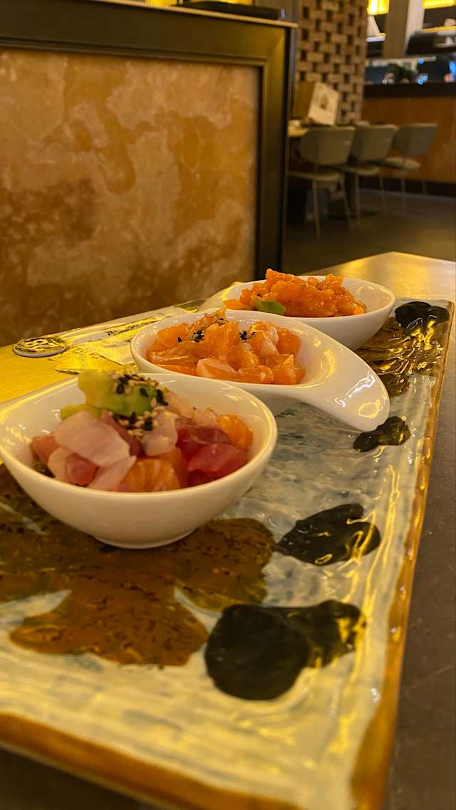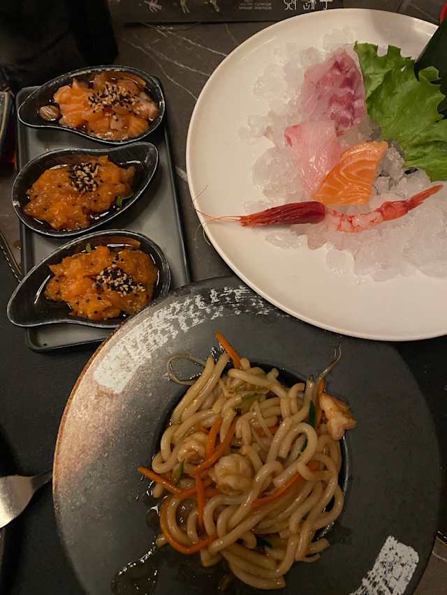 - Carpaccio di salmone, tonno, branzino, gambero rosso e scampi con salsa ponzu
