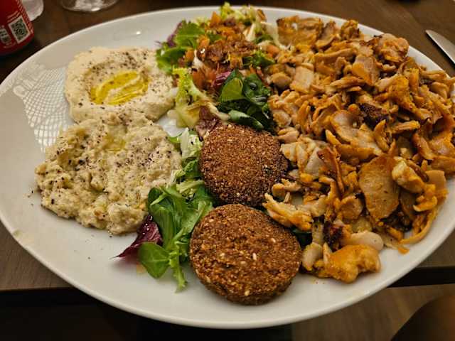 - Pollastre amb hummus, mutabal, fattoush i falafel