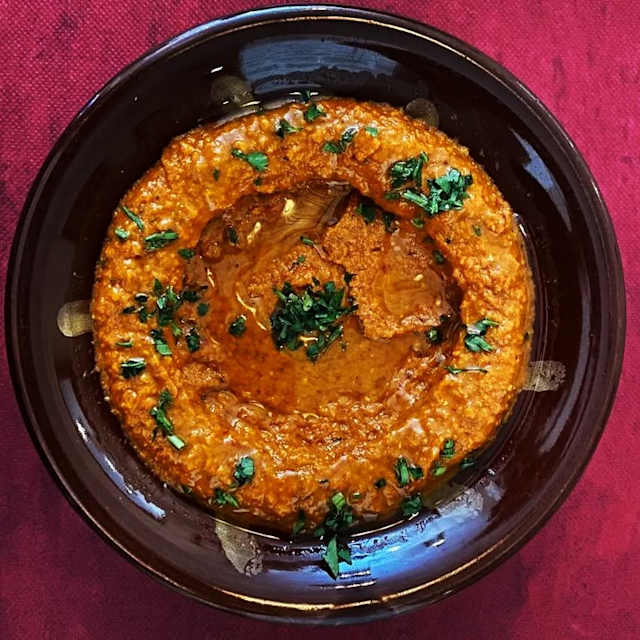 - Puré de cigrons amb tahini cobert amb carn de xai