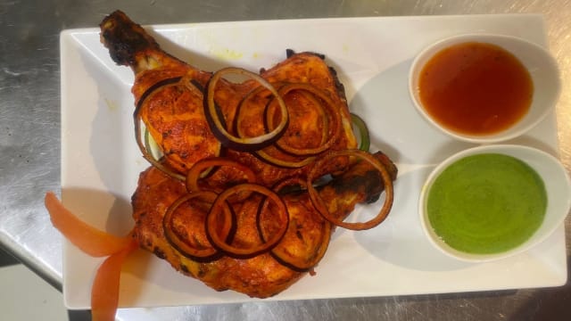 Pieces of red chicken from the clay oven, marinated in pepper sauce (extra hot)