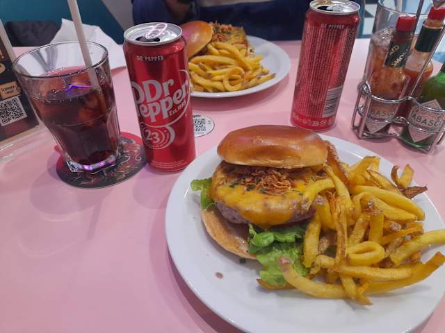 - Steak haché frais, red cheddar, oignons caramélisés, bacon, salade, sauce BBQ. Sauce cheddar maison dégoulinant sur le bun | yummmy ! Servi avec frites fraîches maison.