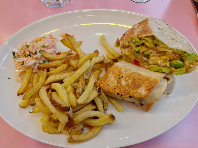 - Riz, poivrons, edamame, avocat frais, pico de gallo, fromages, coriandre, épices mexicaines et sauce avocado chimichuri dans une galette de maïs. Accompagné de frites fraîches et de coleslaw maison.