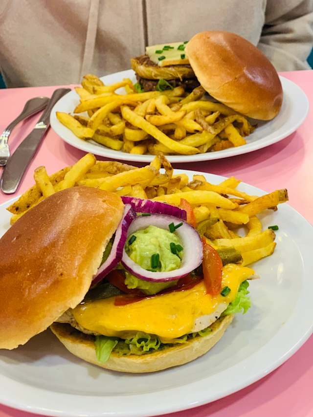 - Bun vegan, plant based burger steak beyond, faux-mage vegan, salade, rondelles d'oignons rouges, tomate snackée, sauce french's mustard et kethchup. Servi avec frites fraîches maison.