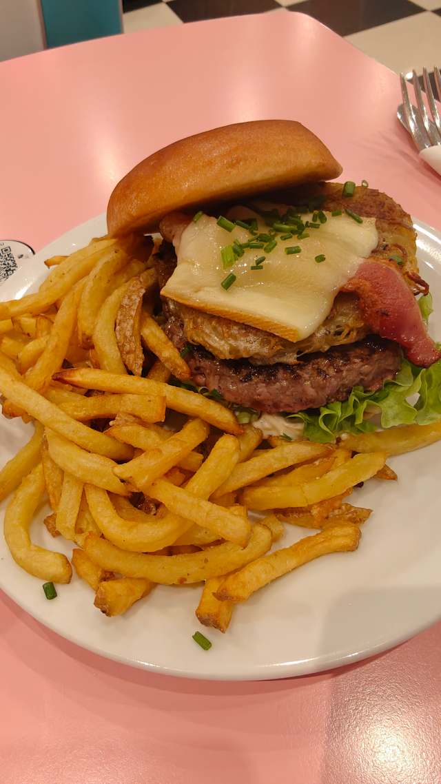 - Steak haché frais, reblochon, oignons à la crème et ciboulette, bacon, galette de pomme de terre, salade, crème moutardée. Servi avec frites fraîches maison.