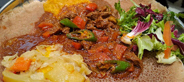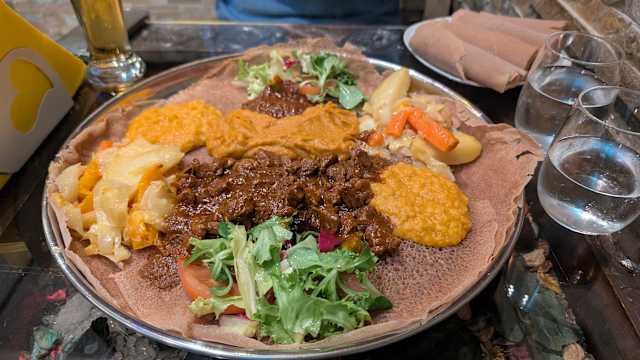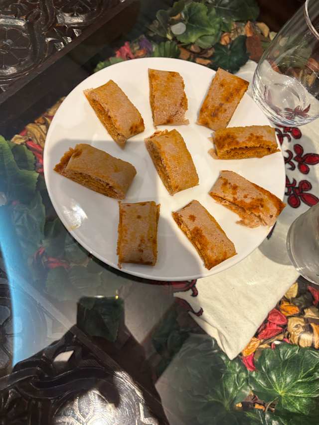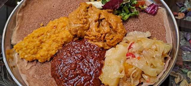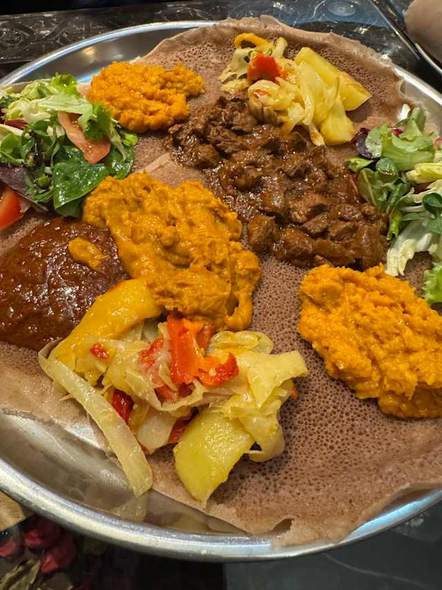 - Piatto vegetariano (spinaci in salsa piccante, purè di ceci speziati, crema di lenticchie rosse, alliccia)