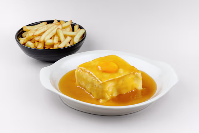 - Bife de novilho, salsicha, linguiça fumadas, fiambre, mortadela, queijo gratinado, ovo estrelado, batata frita e molho à dote