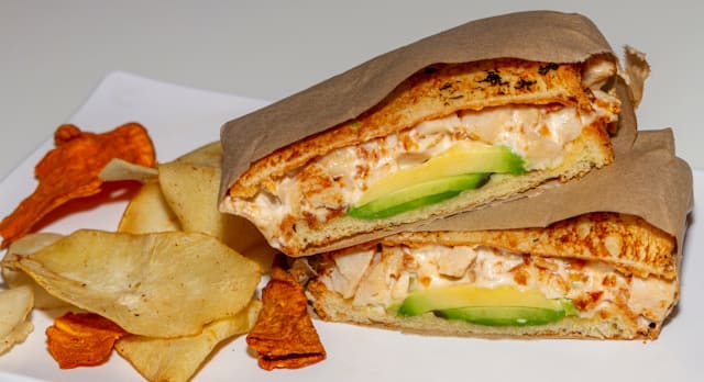 Pan brioche, pollo, aguacate, cebolla crujiente queso crema y salsa spicy mayo