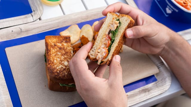 Pan brioche, atún en aceite, aguacate, queso crema, queso cheddar y salsa mostaza y agave