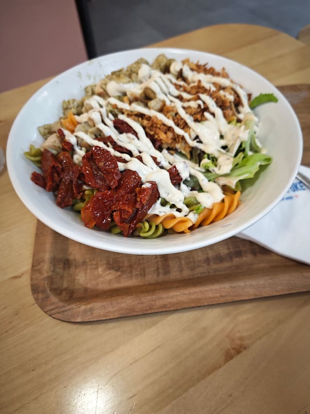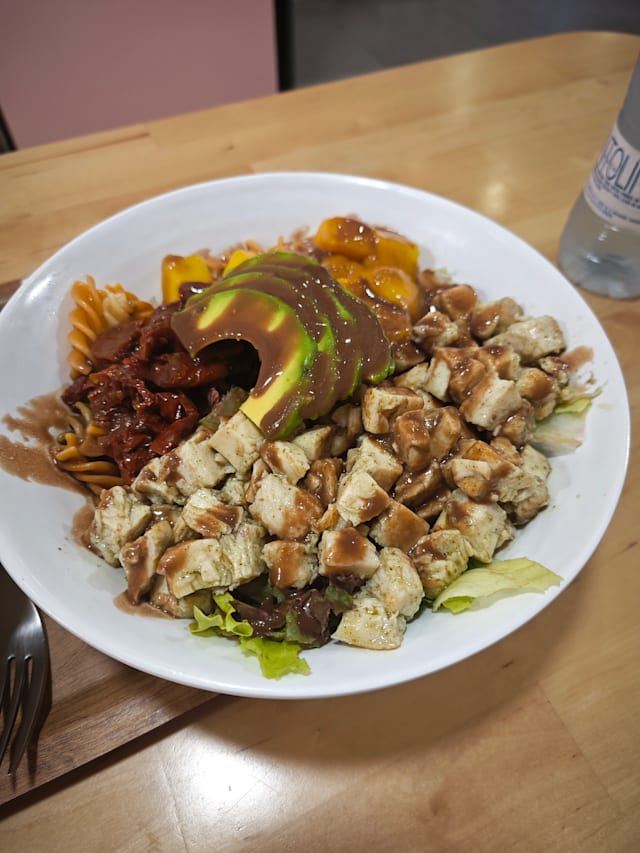 Tortilla de trigo • pollo • guacamole • pico de gallo nueces • rúcula • maíz • cherrys • salsa mayo vegan