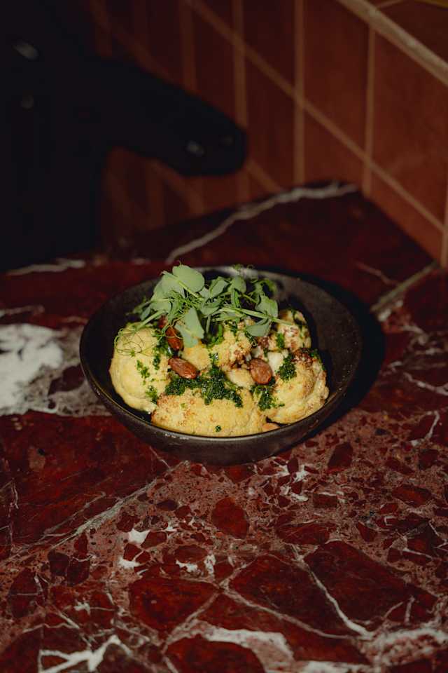 - Grilled cauliflower with salsa verde and toasted almonds.