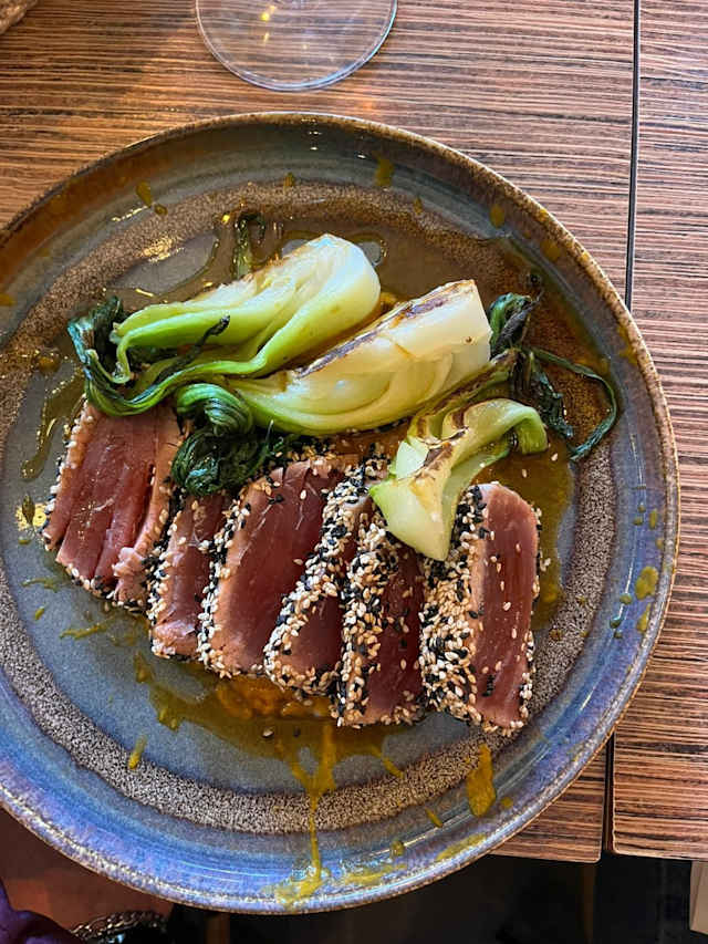 - Tataki di tonno panato al sesamo, carote allo zenzero, cavolo orientale e riduzione di miele e soia.