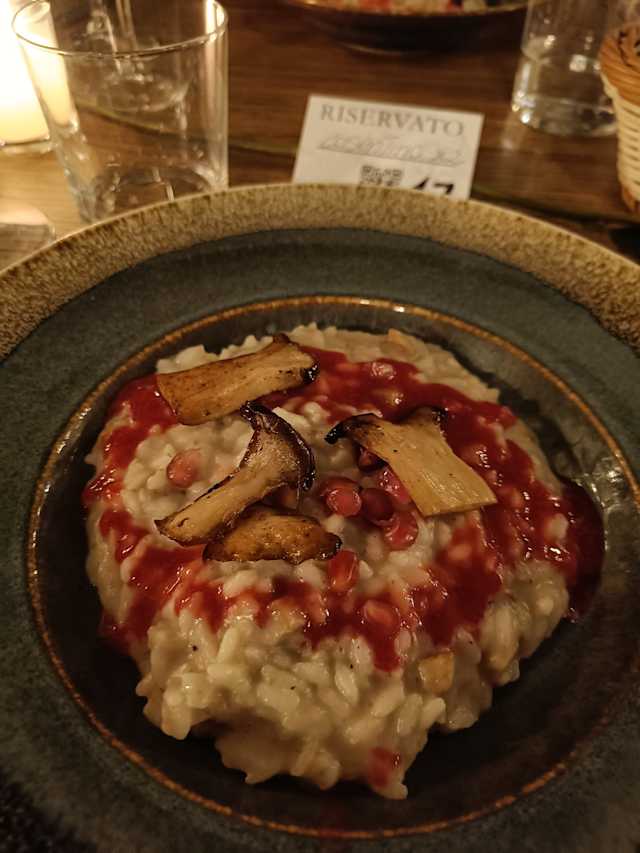 - Riso carnaroli con funghi cardoncelli, crema e chips di topinambur e melograno.