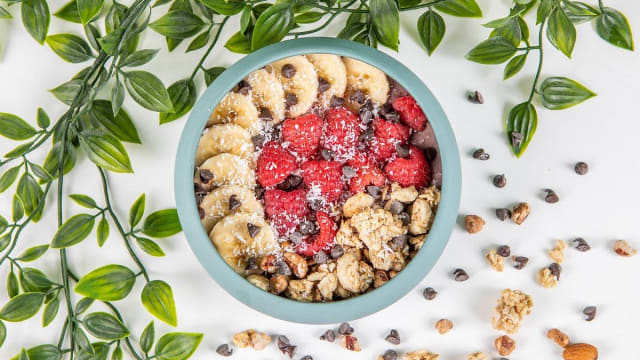 Banane, framboise, coco rapée, beurre de cacahuète (servi à part), granola chocolat nu morning