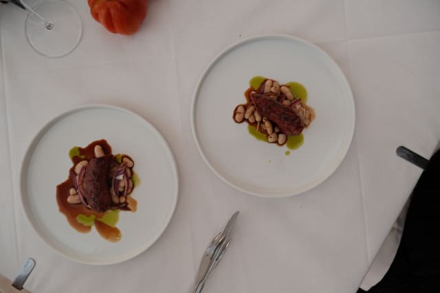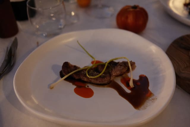 Capocollo di maiale, albicocche sott’aceto, olio di nduja