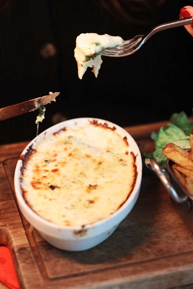 - Camembert au lait cru rôti, genièvre et noisettes torréfiées. Servi avec des pommes de terre grenailles