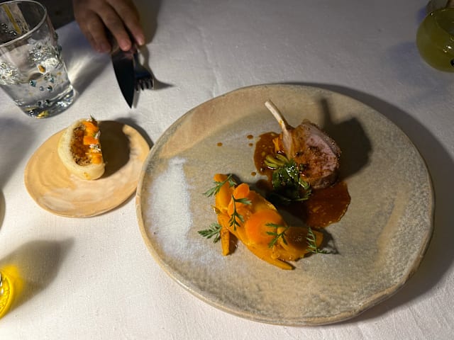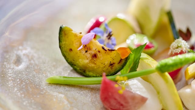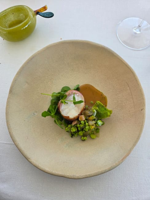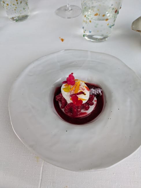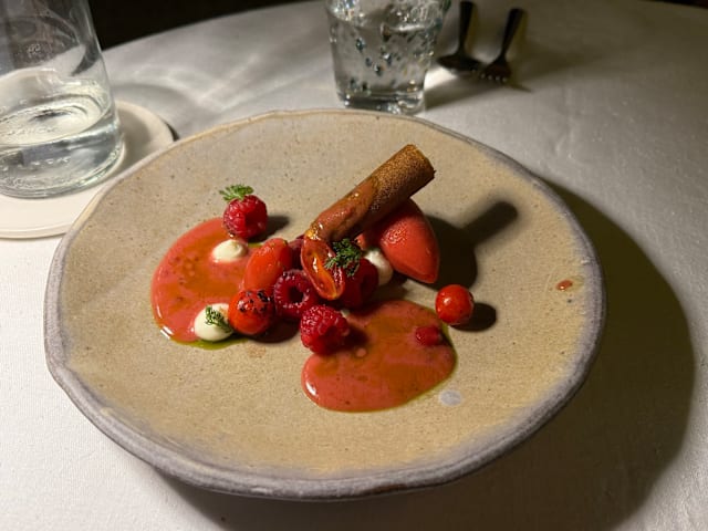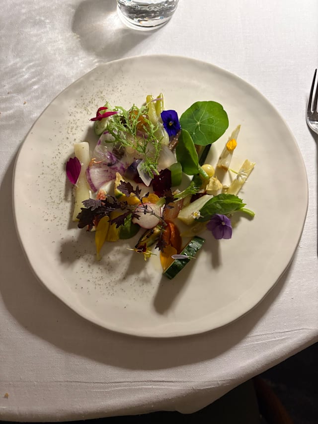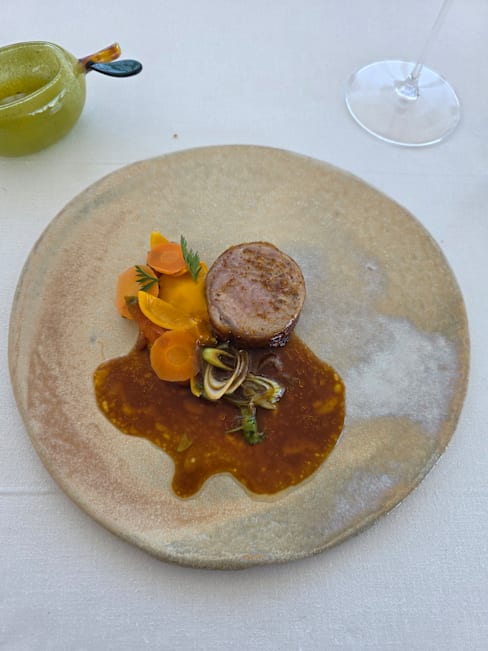 7.5/10A perfectly nice evening with agreeable food, focused on locally sourced vegetables. But when the bill is approaching €200 per person, we were missing the “wow” factor in terms of taste experience. Nothing really left the taste buds zinging. Service rating is low as again expectations are high and the first part of our evening was rather chaotic compared to what should be a perfectly choreographed “ballet” in this sort of restaurant. We were left waiting for a good 10 minutes after ordering water before being asked what aperitif we wanted. A second waiter then asked us what we wanted for water and aperitif. The amuse bouche when it finally arrived was put on the table with no explanation. Then were asked to pick our wine before we’d seen a menu. After that, things did settle into more of a well orchestrated order. The setting is a pretty terrace with views of the domaine and the valley. The ambiance is very low key and rather muted, with the piped music a bit “elevator”-like!