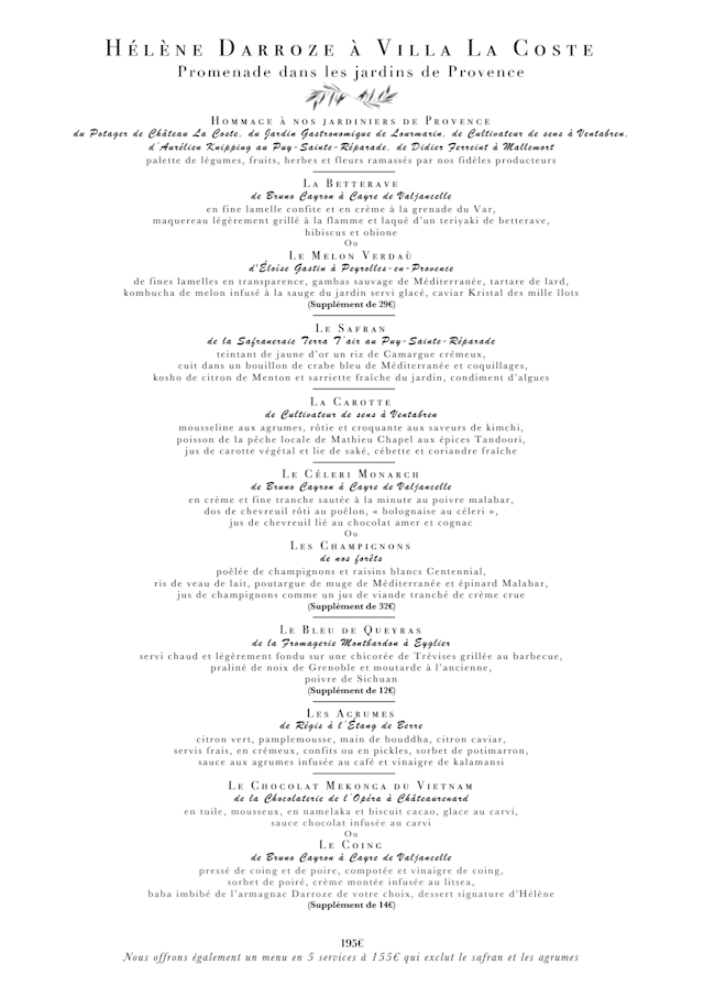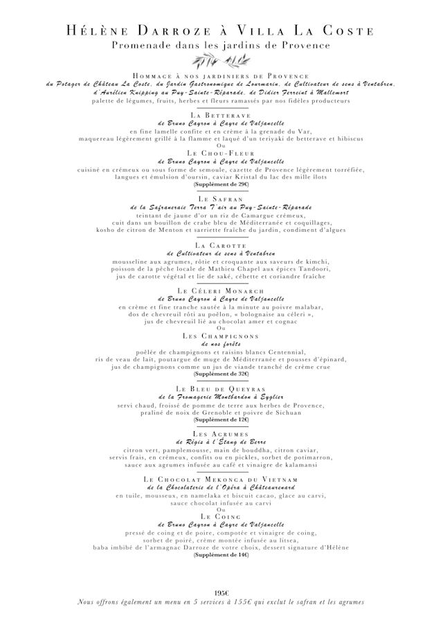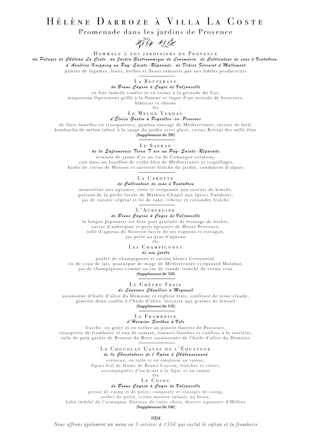 Dear Patrice Martel, Thank you very much for such a nice message. We are delighted to hear you enjoyed your time with us as much as you did our cuisine. We do hope to be able to welcome you again. Best wishes, Helene Darroze à Villa La Coste Team.