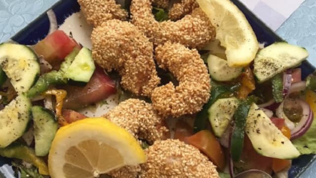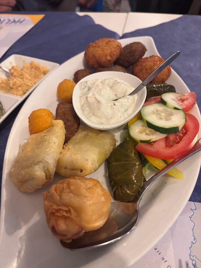 Varieta' di polpette e spiedini con carne di ghiros ed insalata pita e salse