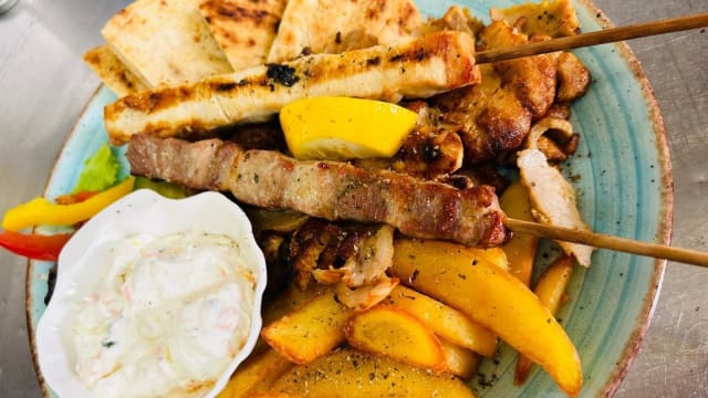 Varietà di polpette e spiedini con carne ghiros, insalata greca e patate fritte, pita e salsa