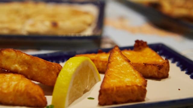Baccala fritto con contorno e salsa skordaglia