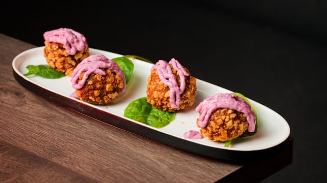 Polpette di scottona con salsa alla carbonara e guanciale croccante