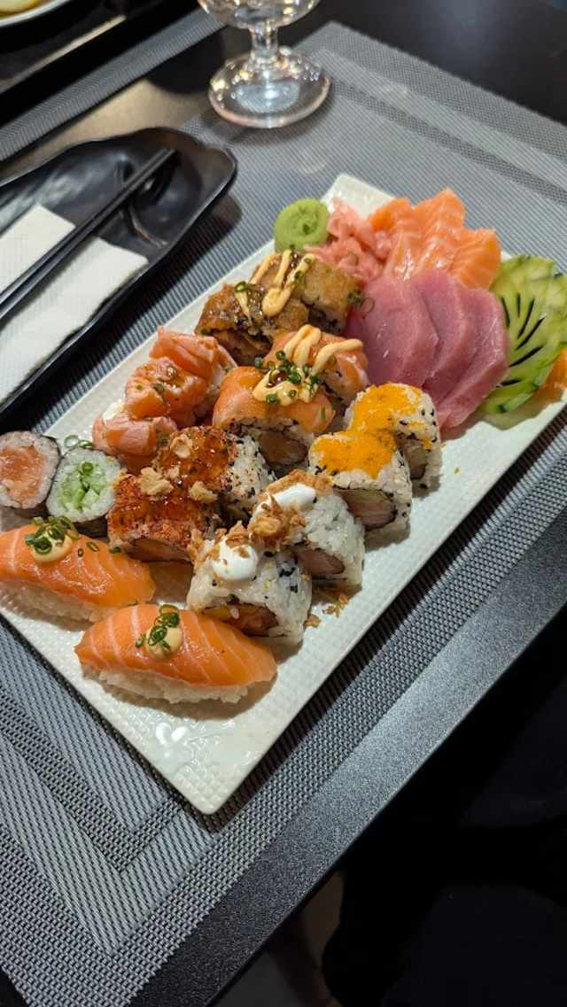 - Sashimi 6pcs, nigiri 2pcs, gunkan 2pcs, roll manga 2pcs, roll avacado 2pcs, hossomaki 2pcs, veg roll 2pcs, mountain roll 2pcs hot roll 2pcs.