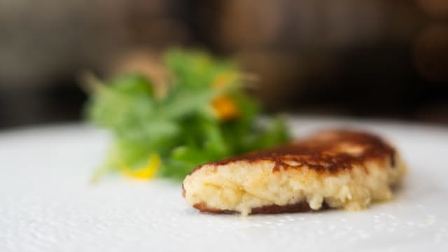 Caillette de blette et abats, petit gratin de côtes à la moutarde, cornichons maison, sauce barbecue de piment « Padron »