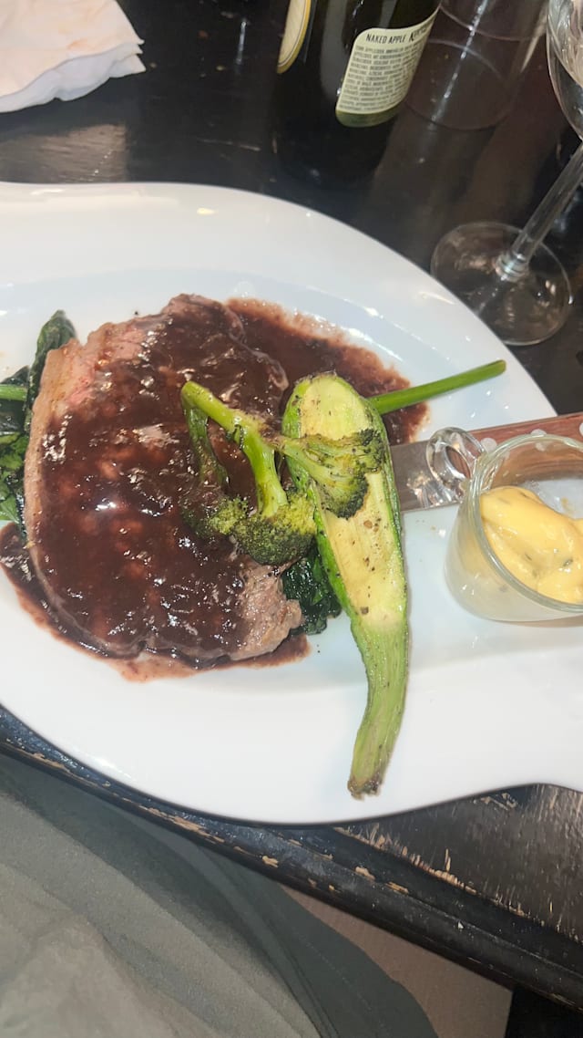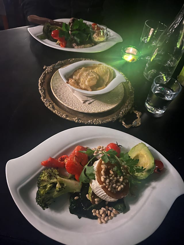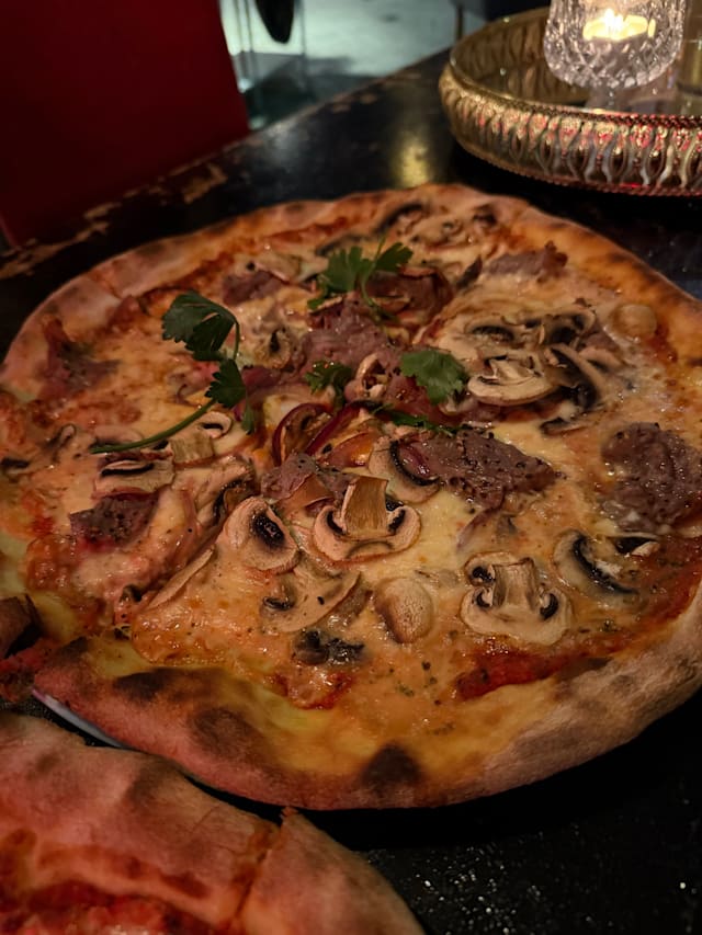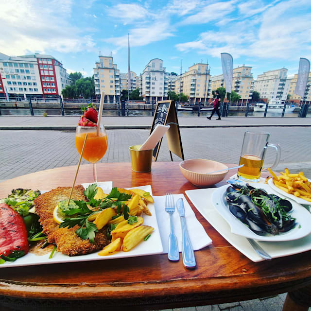 9/10We were seated on the terrace with view on quay. The chairs were all different, baroc style or wood, so it looked a bit messy, so were not expecting so much. But the food was very good! Large pizza's, well filled plates fresh vegetables, with the schnitzel and the US meat. Only a bit much salt on the fries. Nice desserts. Friendly staff. Only menu in Swedish, but they translated for us.